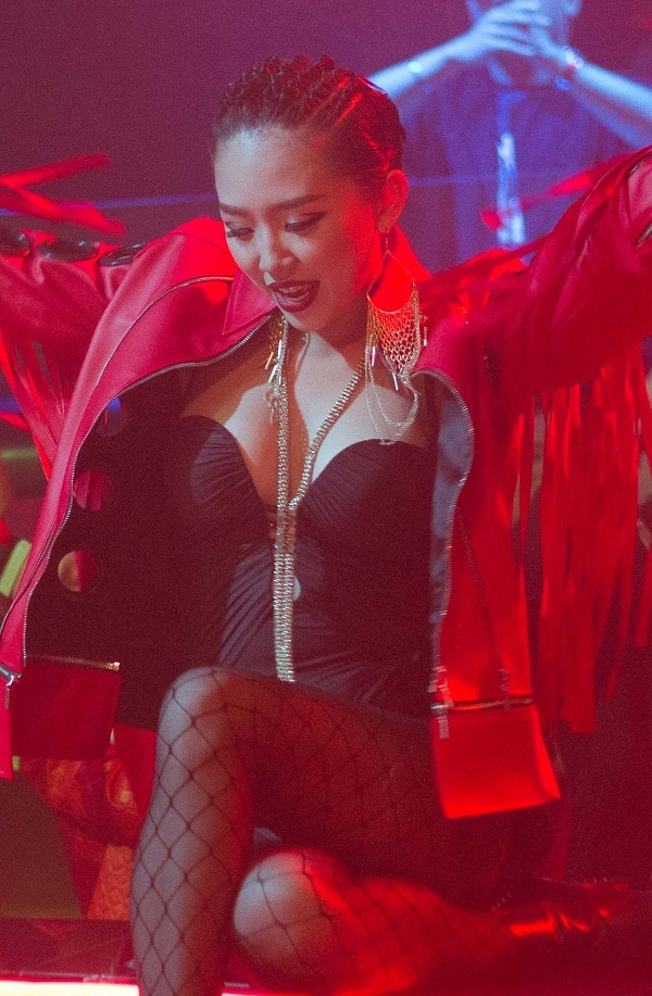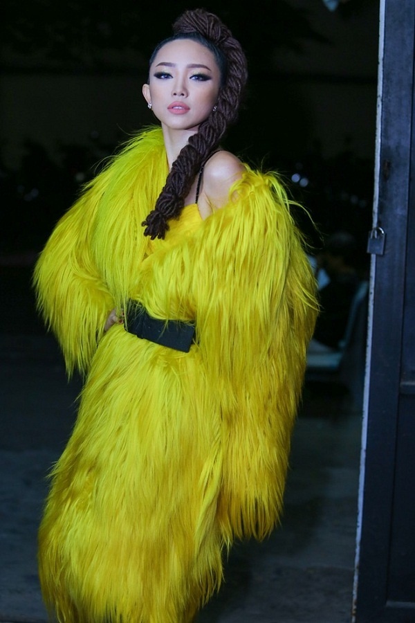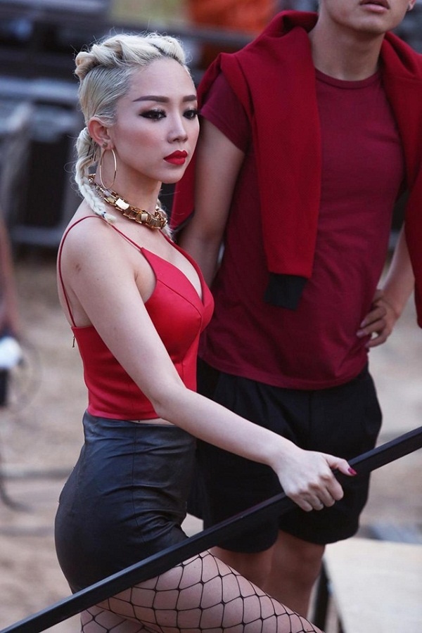 Mái tóc trắng kết hợp với bộ đồ gai góc khiến Tóc Tiên nổi bật. |