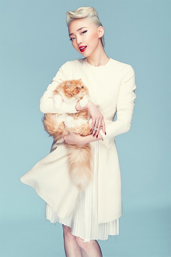 Mái tóc bạch kim vuốt cao, tạo sóng nhẹ nhàng phù hợp với shoot hình mang phong cách cổ điển. |