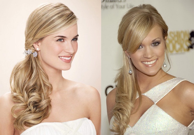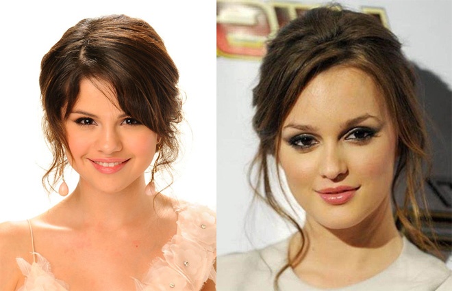 | Chia tóc mái thành 2 phần lệch nhau. Buộc túm toàn bộ tóc qua trái hoặc phải. Quấn tóc thành từng búi tròn theo tầng, kết hợp uốn lọn xoăn hoặc đánh rối phần đuôi tóc. Bạn cũng có thể tạo độ phồng cho phần đỉnh đầu để “kéo dài” khuôn mặt. |