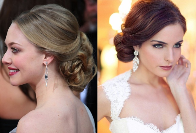 | 2. Tóc búi lệch thấp. Luôn mang đến vẻ đẹp ngọt ngào, quyến rũ và vương giả, kiểu tóc này là “cứu tinh” cho những cô dâu mặt chữ O tròn trịa. |