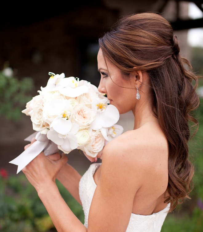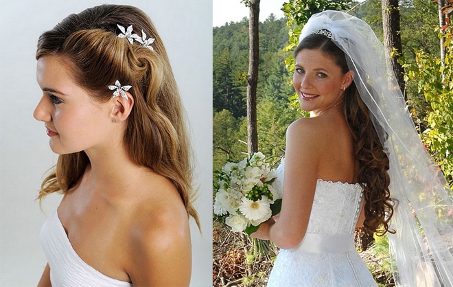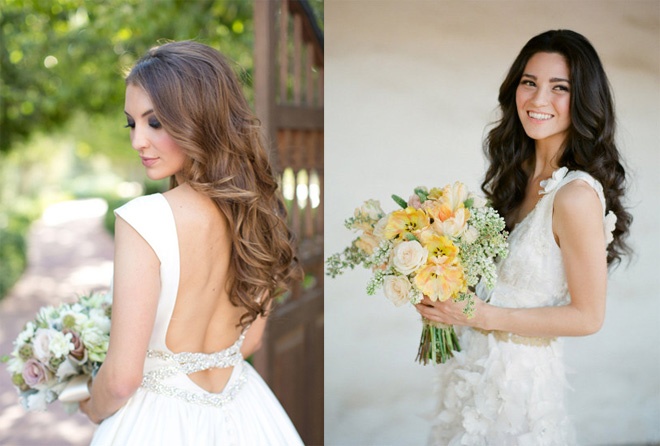 | Nếu yêu thích vẻ đẹp tươi sáng và thanh khiết, bạn chỉ nên để tóc buông dài tự nhiên, uốn lọn xoăn nhẹ nhàng. Tăng thêm độ kiêu sa cho kiểu tóc này bằng cách chọn váy áo và hoa cưới thật lộng lẫy và sang trọng. Lưu ý là phần thân trên và khuôn mặt sẽ thanh thoát, mảnh mai hơn nếu bạn kết hợp cùng váy áo khoét sâu ở cổ hoặc sau lưng. |