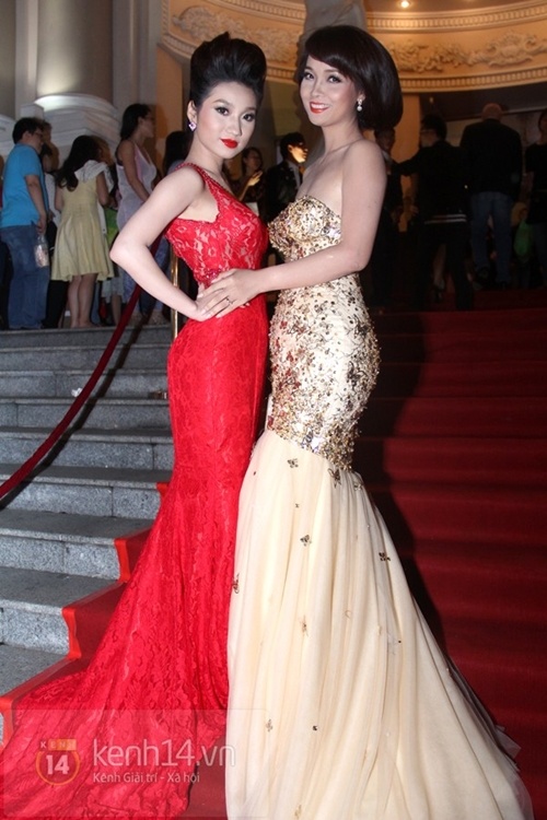 | Đứng cạnh Mai Thu Huyền, Cao Mỹ Kim thậm chí trông còn già dặn hơn hẳn đàn chị với kiểu tóc bồng chải ngược quá ư dữ dằn. |