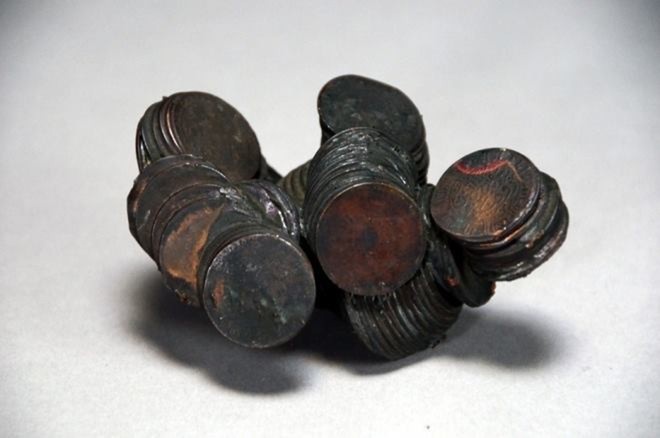 Một tuần sau vụ ném bom, Kinzo Imura thấy những đồng xu nóng chảy dính lại với nhau trong ngôi nhà đổ nát của một người thân. Cháu trai của ông, Kazuhiko Ninomiya, lưu giữ những đồng xu trước khi tặng chúng bảo tàng. |