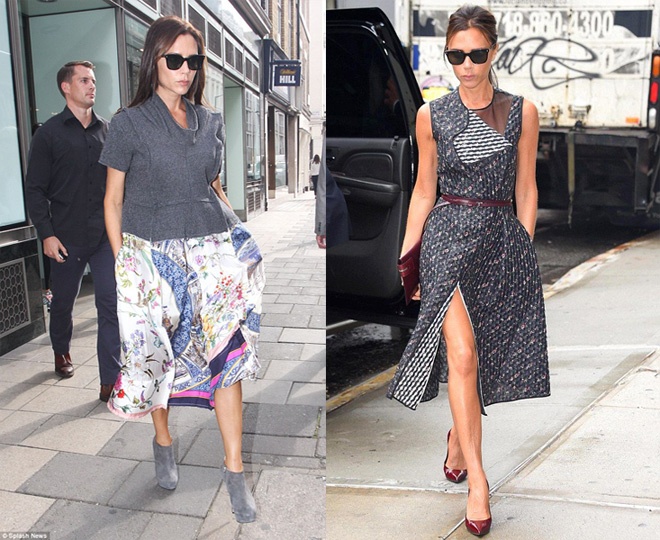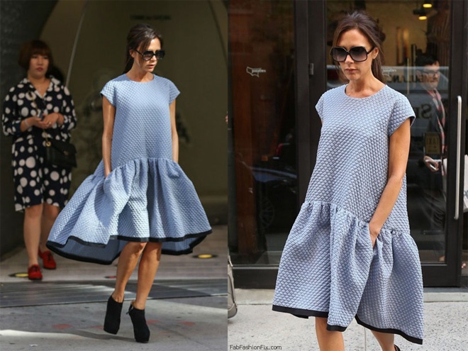 | Cựu thành viên nhóm nhạc Spice Girls đình đám hay chọn các thiết kế ôm sát để khoe vóc dáng đồng hồ cát. Do đó, cả đám đông trên phố đã phải “tròn mắt” khi thấy bà Beck diện váy over size rộng thùng thình. Các đường nhún bèo dường như khá xa lạ so với phong cách thường ngày của nhà thiết kế nổi tiếng thế giới. |
