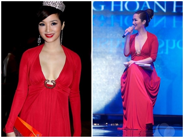 | Khoảng thời gian tái xuất làng giải trí vào năm 2008 - 2009, người đẹp "không tuổi" mạnh dạn dẫn đầu trao lưu diện trang phục cổ chữ V hở táo bạo. Sau sự xuất hiện của Hoa hậu đền Hùng 1992, nhiều người đẹp Vbiz đã chạy theo trào lưu này. |