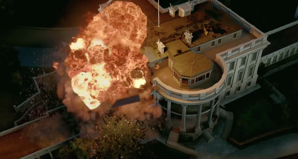 White House Down (2013) Mức độ thiệt hại: 70% Vụ khủng bố thổi bay nóc của tòa nhà bằng một lượng chất nổ cực lớn, phá hủy một phần của nhà bầu dục. Cảnh sát Cale giải cứu tổng thống kịp thời và ngăn chặn cuộc không kích với mục đích đưa toàn bộ khu vực Nhà Trắng trở về thời kỳ đồ đá. |