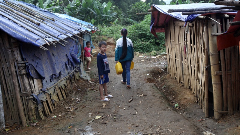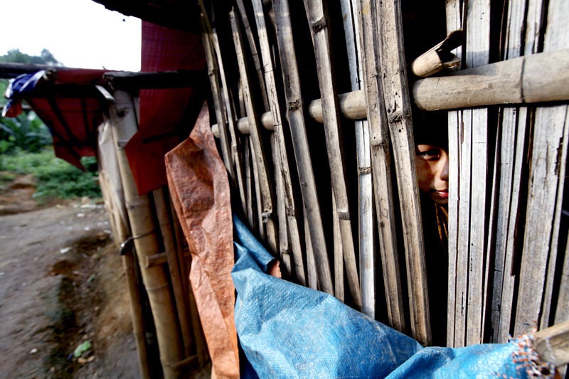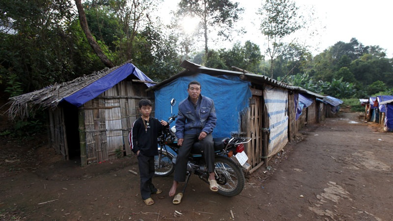 | Sắp gió mùa đông bắc, Hoàng Văn Thành đan lại những khoảng hở quá lớn trên phên nứa của lán trọ để bớt đi những cơn gió rét cắt da cắt thịt của vùng cao. |