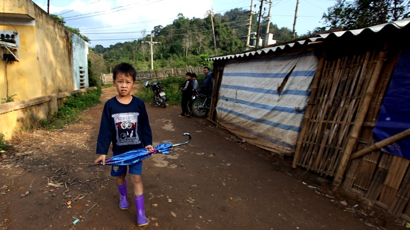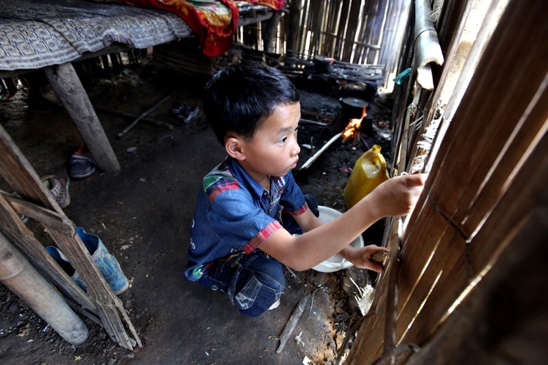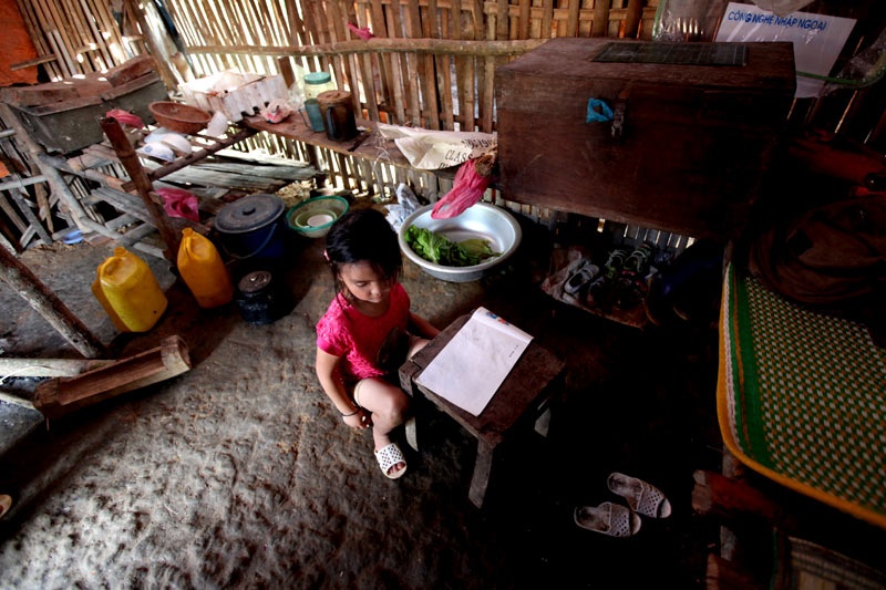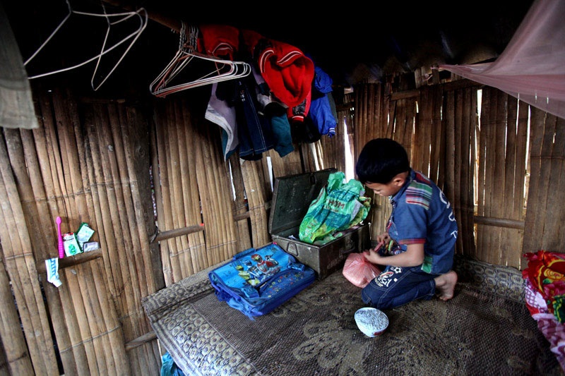 | Em họ Nguyện, học sinh lớp 3 Vương Văn Vượng đến khu trọ 2 giờ đi bộ từ nhà ở bản Nà Coóc sau ngày nghỉ cuối tuần. |