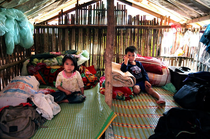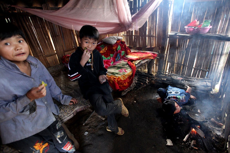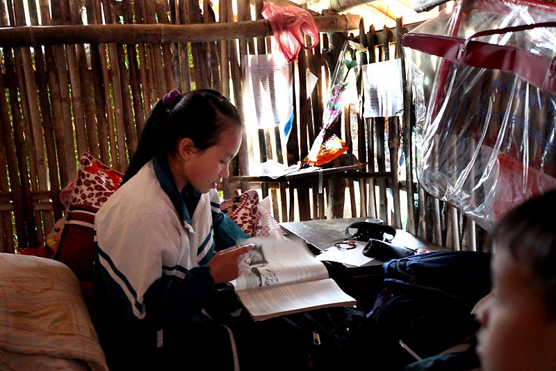 | Nữ sinh lớp 8A, Vương Thị Nguyện, nhà ở bản xa Nà Coóc trọ học trong căn lán chừng 3 m2 cùng với em ruột và 2 em họ. |