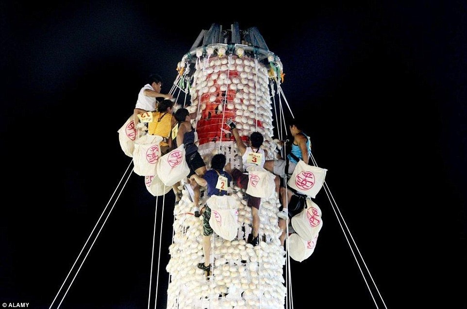 Vào nửa đêm ngày diễn ra lễ cướp bánh, 9.000 chiếc bánh bao (giờ được làm bằng nhựa) được gắn lên 3 tháp cao 14 m. Trước đây, bất cứ ai cũng có thể tham gia, người nào lấy được càng nhiều bánh thì càng gặp nhiều may mắn. Ngày nay, vì lý do an toàn, chỉ một số người nhất định có kỹ năng leo trèo được tham gia cuộc thi. Ảnh: Getty Images.