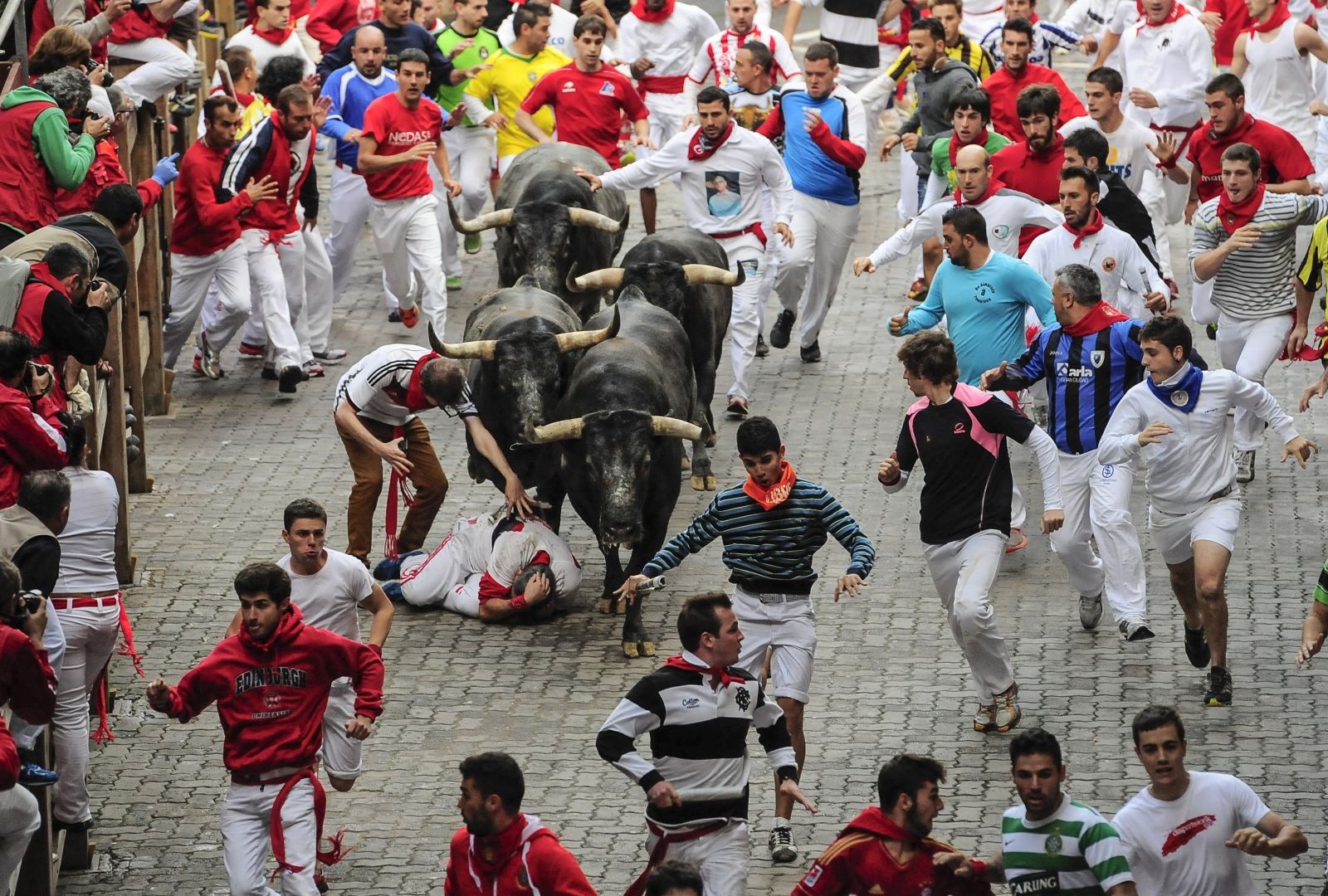 Những con bò tót được thả ra trên đường phố Pamplona trong lễ hội kéo dài 8 ngày. Hàng nghìn người tham dự trong trang phục màu trắng đỏ chạy đua với chúng, xô vào nhau, nhiều người bị chúng dẫm lên. Sự nguy hiểm dường như càng làm cho người tham dự thêm phấn khích. Ảnh: Metro. |