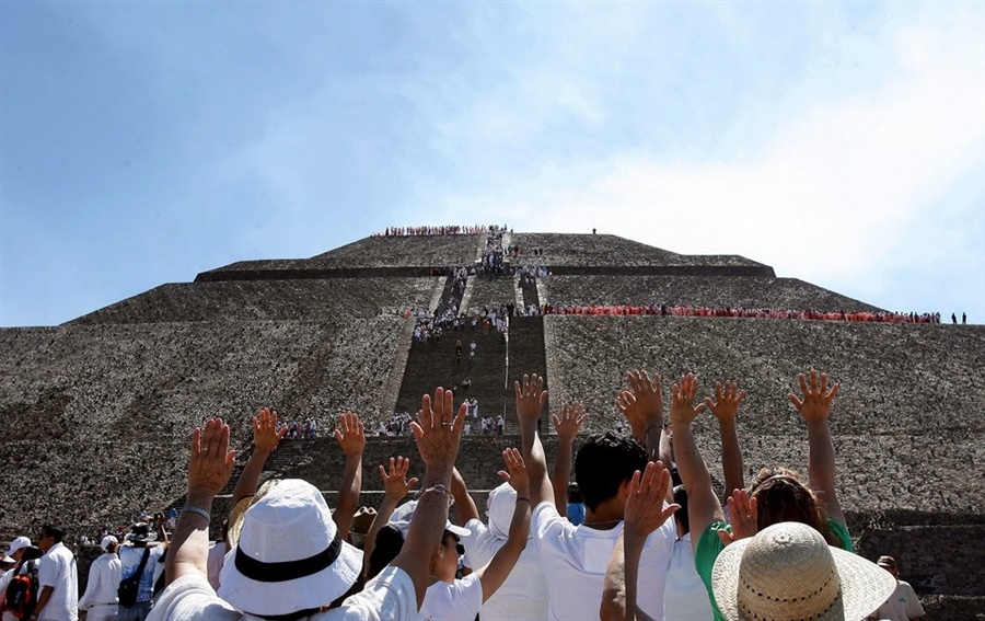 | Vào ngày 20 hoặc 21/3 hàng năm, hàng nghìn người dân Mexico cùng nhau tập chung tại khu khảo cổ Teotihuacan, cách thủ đô Mexico khoảng 48 km về phía đông bắc, để tham dự lễ hội xuân phân. Khoảng từ 9h sáng tới 13h chiều, họ sẽ leo 360 bậc thang dẫn tới đỉnh kim tự tháp Mặt trời với niềm tin các vị thần sẽ ban cho họ năng lượng và sức khỏe. Ảnh: Alex Cruz. |