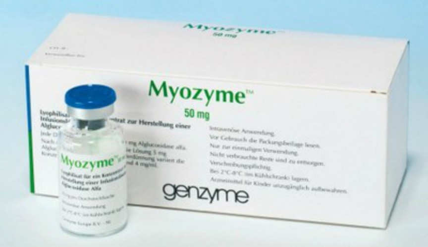 Myozyme. Bệnh Pompe là một hội chứng di truyền ngăn cản quá trình xử lý thông thường từ glycogen thành glucose, một loại đường cung cấp năng lượng cho các tế bào. Myozyme được sử dụng để ngăn ngừa sự tích tụ chất glycogen độc hại trong cơ thể. Myozyme chỉ được sử dụng trong các chương trình y tế đặc biệt để phòng tránh các phản ứng dị ứng nghiêm trọng có thể xảy ra trong và 3 giờ sau khi uống thuốc. Trong 40.000 người mắc bệnh Pompe, chỉ có 1 trường hợp có thể bị yếu cơ, khuyết tật tim đe dọa đến tính mạng, gan to và suy hô hấp khi sử dụng Myozyme. Giá thuốc sử dụng trong một năm 300.000 USD. |