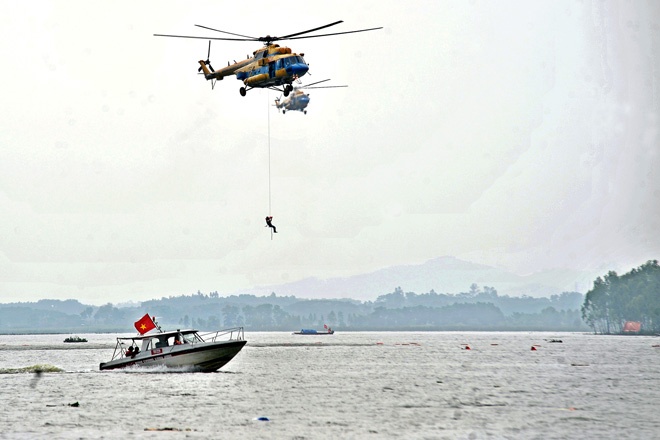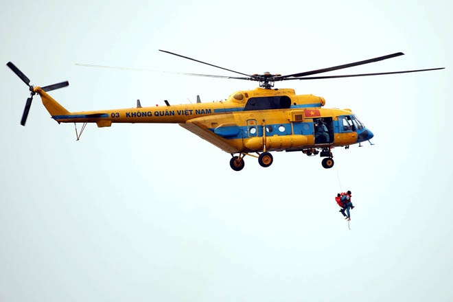 | Cứu hộ người dân từ trên không bằng dây cáp. |
