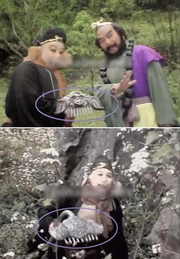 Trong tập 10 khi 3 lần đánh Bạch Cốt Tinh, cây cào sắt 9 răng của Trư Bát Giới có hình đầu heo, mõm dài (ảnh trên), nhưng sang tập 12, nó biến thành hình dạng khác (ảnh dưới). |