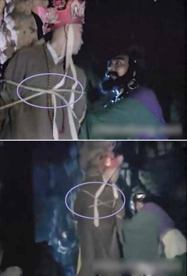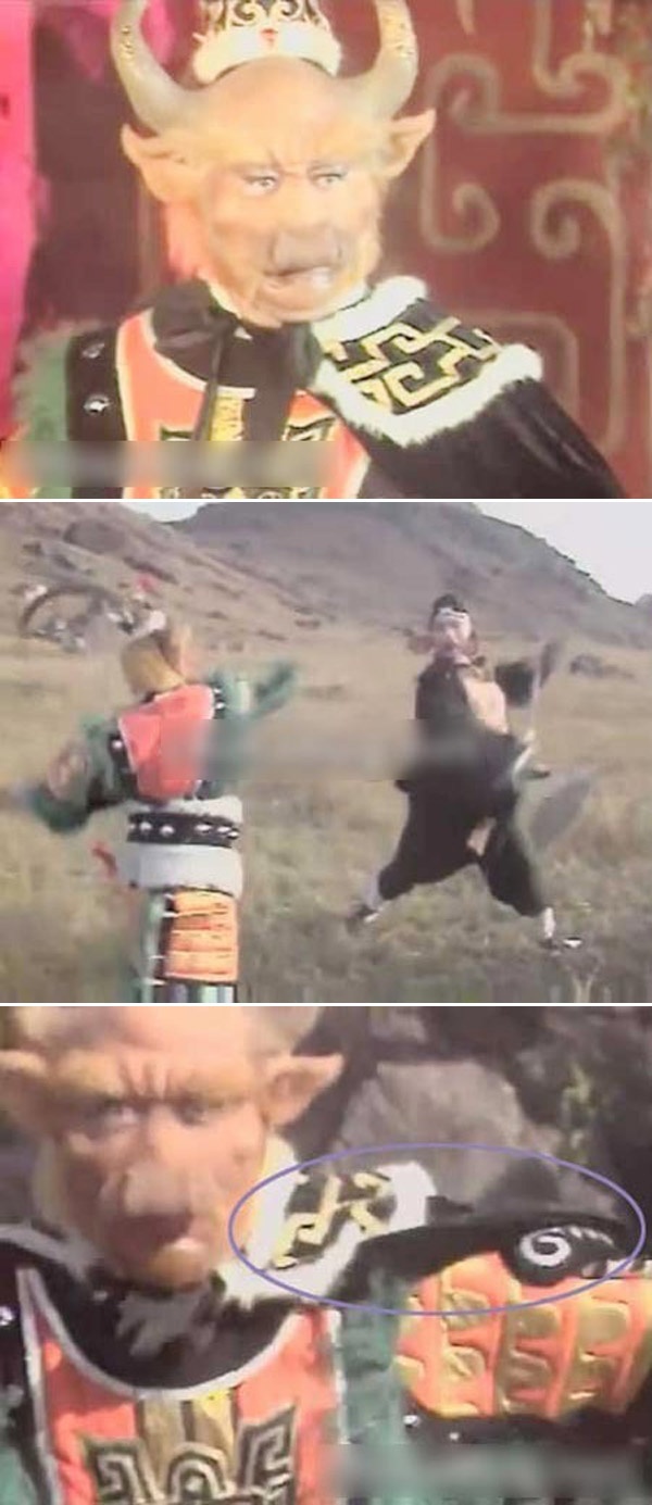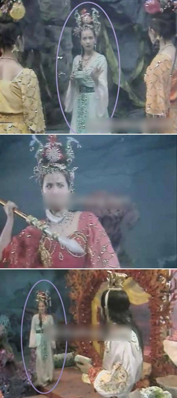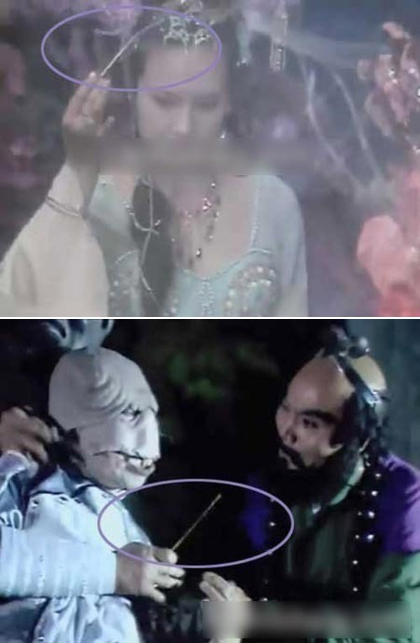 Cảnh Sa Tăng cứu Đường Tăng, khi quay gần, dây đai vải mũ đội đầu của Đường Tăng nằm bên trái gút thắt dây thừng (ảnh trên). Lúc quay toàn cảnh, dây đai nhảy sang bên phải (ảnh dưới). |