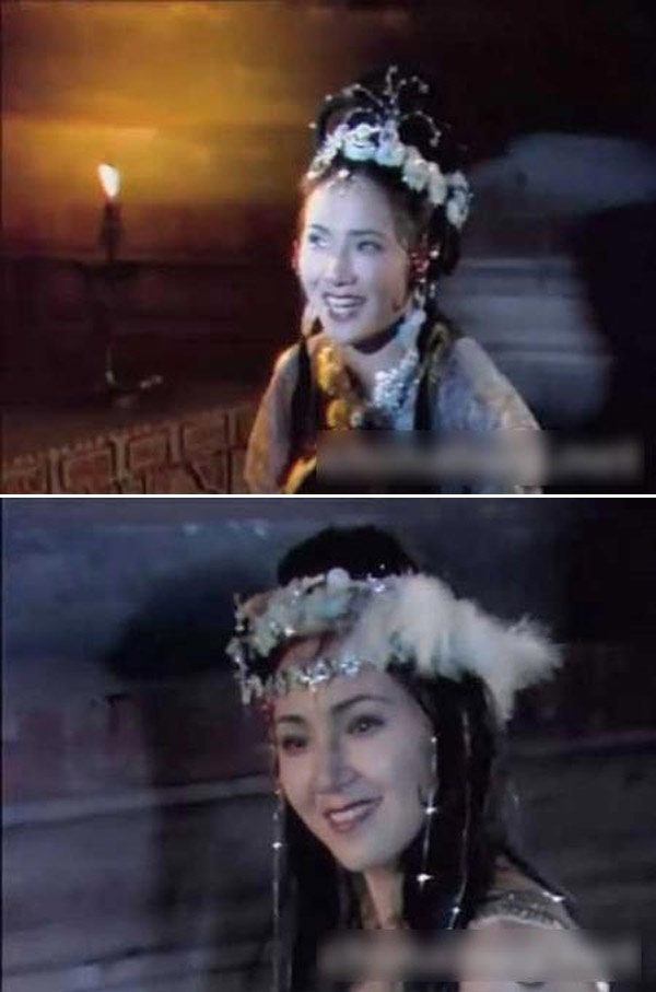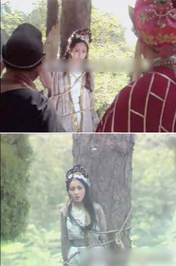 Cùng một cảnh yêu quái biến thành cô gái xinh đẹp bị cột nơi gốc cây nhưng 2 lần quay có 2 kiểu cột dây khác nhau. |