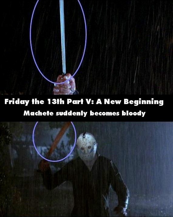 | Friday The 13th Part V: A New Beginning (1985): Cây mã tấu trên tay Jason đã tự động chuyển màu một cách bí ẩn chỉ trong một phân cảnh. |