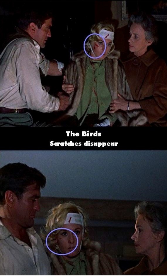 | The Birds (1963): Vết trầy trên mặt của Melanie đã biến mất trong cảnh sau. |