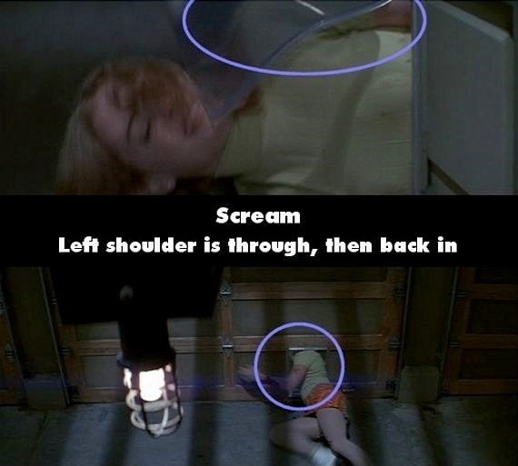 | Scream (1996): Trong cảnh quay ngoài thì rõ ràng vai của diễn viên Rose McGowan đã thò được ra ngoài, nhưng trong cảnh quay trong là hoàn toàn khác. |