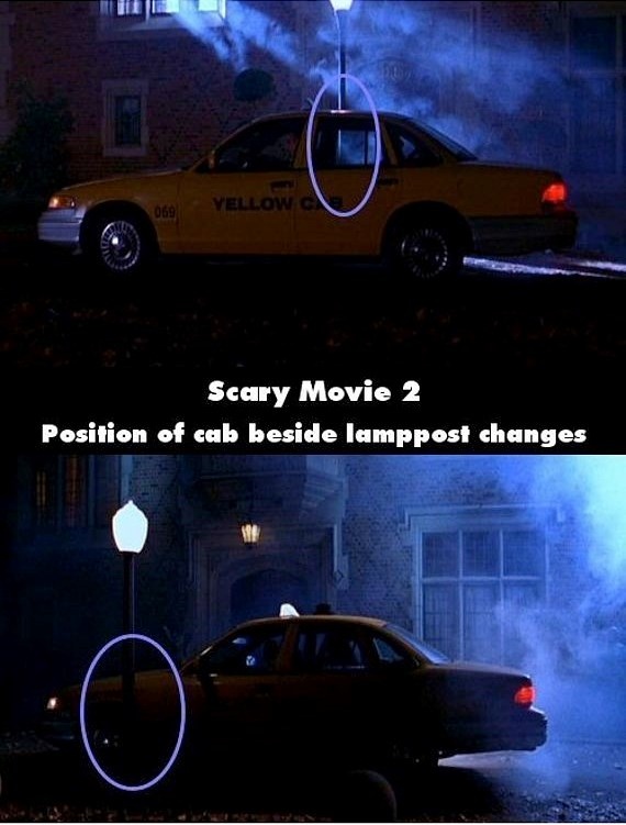 | Scary Movie 2 (2001): Vị trí chiếc taxi đã thay đổi giữa 2 phân cảnh. |