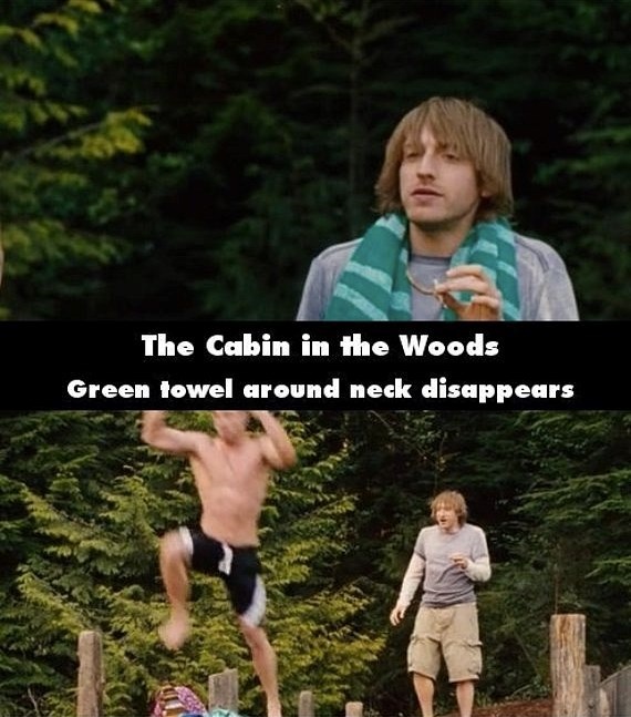 | The Cabin in The Woods (2012): Chiếc khăn quàng trên cổ của Fran Kranz đã biến mất. |