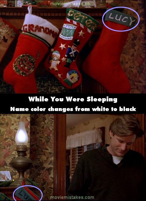 | Chữ Lucy in trên chiếc tất treo lò sưởi của While You Were Sleeping đang từ màu trắng chuyển sang màu đen. |