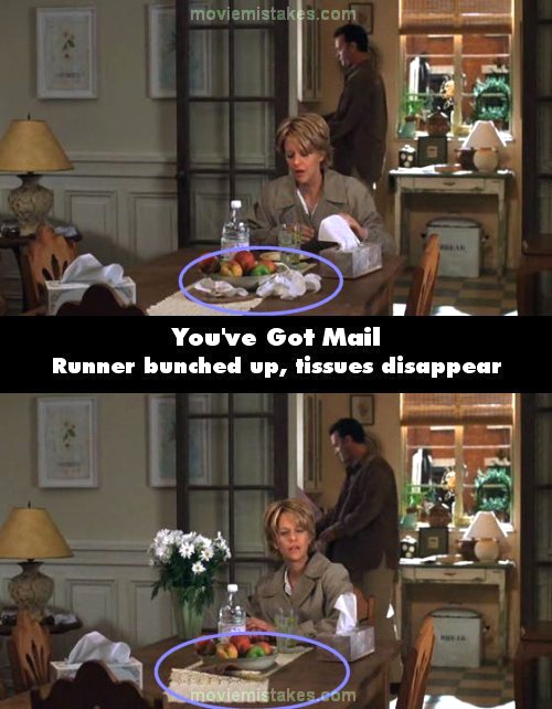 | Trong một cảnh quay của You've got mail, tấm khăn trải bàn biết di chuyển và đống khăn giấy bẩn tự động biến mất chỉ trong nháy mắt. |