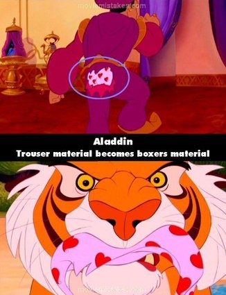 | Trong một cảnh quay của Aladdin, chiếc quần ngoài bị cắn rách nhưng nằm trên miệng chú hổ lại là mảnh vải với hoa văn của chiếc quần lót. |