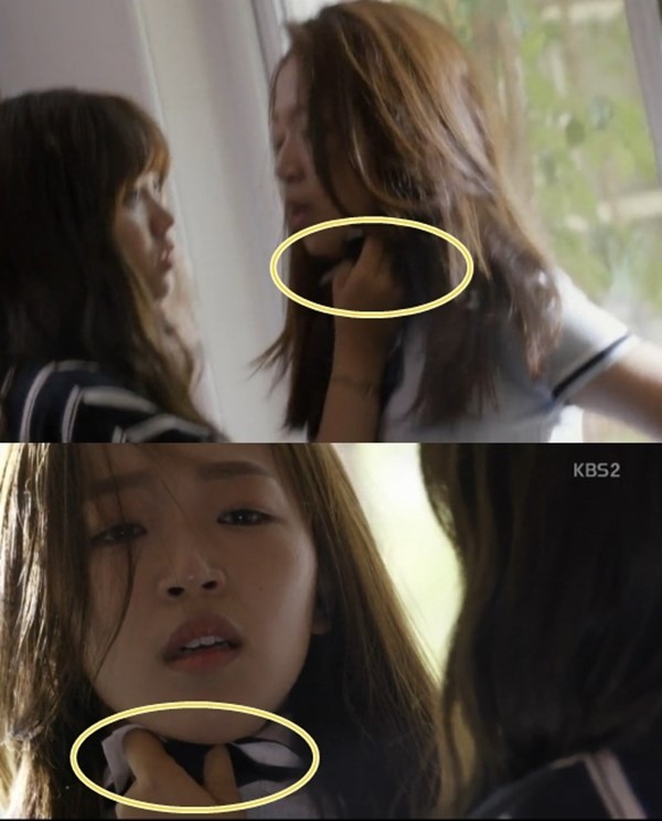 | Trong Who Are You: School 2015, nhân vật đang dùng tay phải để túm cổ áo địch thủ. Thế nhưng khi đổi góc máy lại chuyển thành tay trái. |