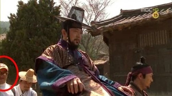 | Một người đàn ông đeo kính, đội mũ lưỡi trai xuất hiện trong một cảnh quay của bộ phim truyền hình Sungkyunkwan Scandal. |