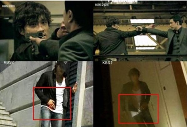 | Trong Iris, vết thương của Kim Hyun Joon (Lee Byung Hun) đổi bên trong hai cảnh quay liền nhau. |