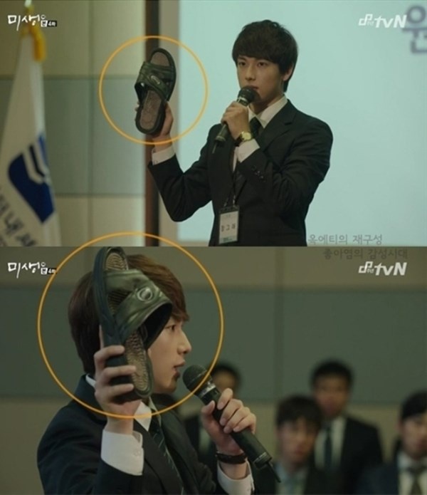 | Trong Misaeng, nhân vật Jang Geu Rae đang cầm chiếc dép phải nhưng chỉ tíc tắc sau lại cầm chiếc dép trái. |