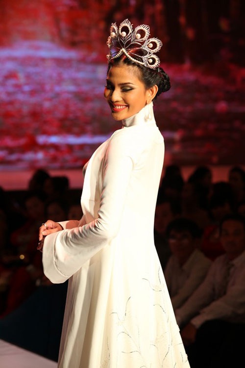 | Trương Thị May và bức ảnh "định mệnh" với chiếc vương miện Mikimoto nổi tiếng. |