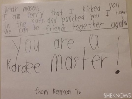 | “Mason thân mến, mình xin lỗi vì đã đấm, đá vào đầu cậu. Mình hy vọng chúng ta không phải làm bạn của nhau nữa. Cậu thật giỏi môn karate”. |