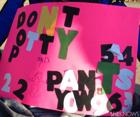 | "Đừng tè ra quần, bố nhé!" - Lori đã làm chiếc bảng hiệu này để cổ vũ bố trong cuộc thi chạy marathon. |