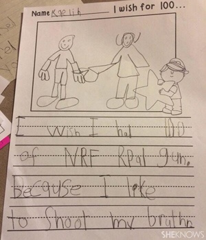 | Trong bài tập điền vào chỗ trống: “Tôi ước có 100…” cậu con trai của Andrea đã trả lời với mong muốn chân thành của mình: “Tôi ước có 100 khẩu súng NRF thật vì tôi muốn bắn anh trai của tôi”. |