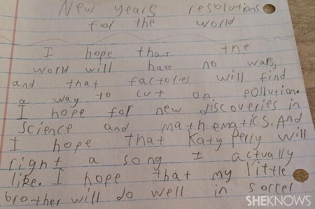 | Với đề bài: "Hãy viết về những giải pháp cho thế giới trong năm mới", cậu bé này đã viết: "Tôi hy vọng thế giới sẽ không còn chiến tranh và những nhà máy sẽ không làm ô nhiễm môi trường. Tôi hi vọng sẽ có những phát hiện mới trong khoa học và toán học. Tôi cũng mong Katy Perry sẽ viết được một bài hát mà tôi thích. Tôi mong cậu em trai sẽ chơi tốt trong môn bóng đá". |