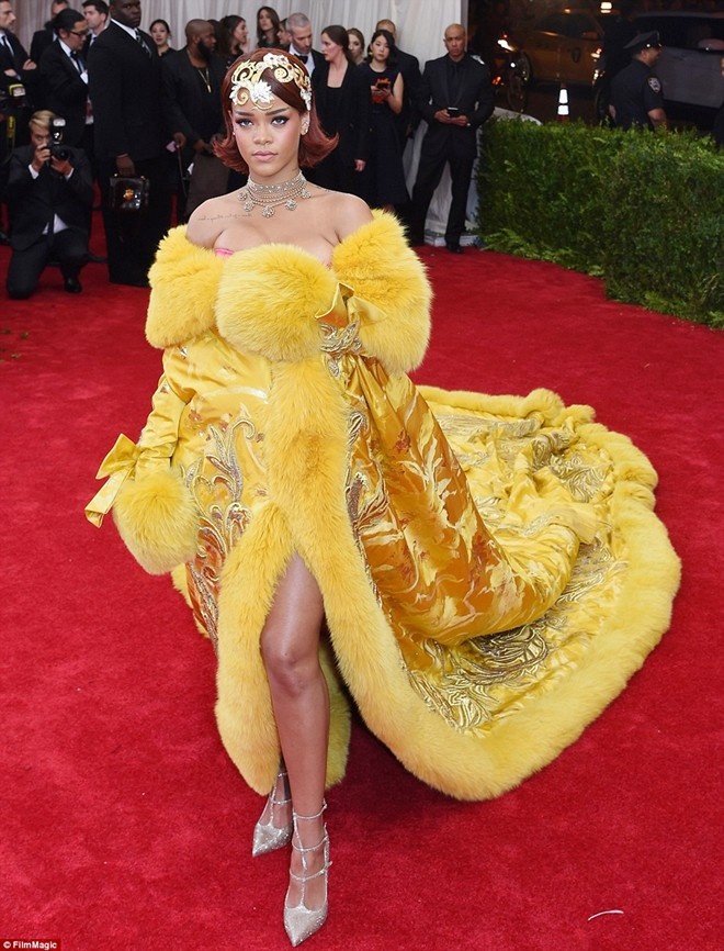Với chiếc váy vàng khổng lồ, Rihanna chính là cái tên gây chú ý nhất tại sự kiện thời trang Met Gala ngày 4/5. Để hợp với chủ đề Trung Hoa qua lăng kính của Met Gala, nữ ca sĩ nóng bỏng chọn cho mình một tác phẩm của nhà thiết kế thời trang người Trung Quốc - Gou Pei.