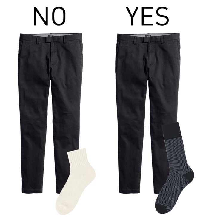 | 1. Mang nhầm tất. Đây là một trong những sai lầm thường gặp nhất của cánh mày râu. Đôi tất trắng thể thao vô tình sẽ làm “mất điểm” phong cách công sở. Các loại tất màu tối, ít hoa văn, họa tiết và có chất liệu không quá mỏng là gợi ý đáng cân nhắc khi đóng bộ cùng quần âu và sơ mi lịch lãm. |