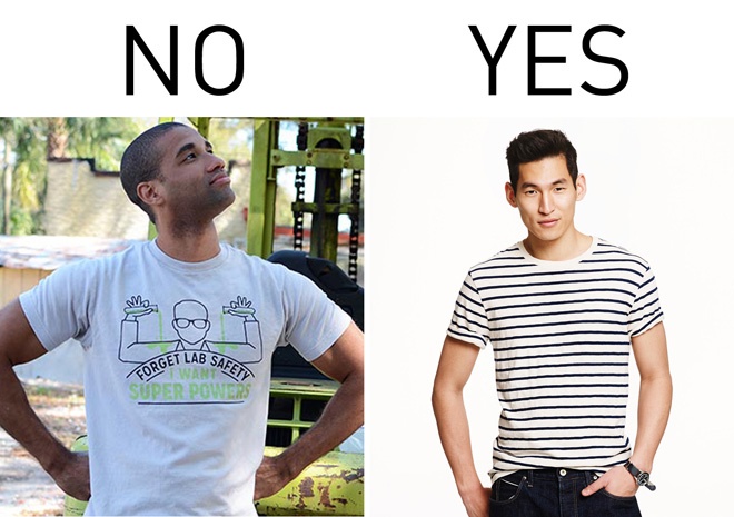 | 4. Áo thun in họa tiết graphic. Các kiểu áo này hầu như chỉ phù hợp với những cậu nhóc tuổi teen. Cánh mày râu sẽ “ghi điểm” hơn hẳn nếu biết chọn áo thun tối giản và chỉ có các sọc ngang nhỏ, màu đơn sắc. |