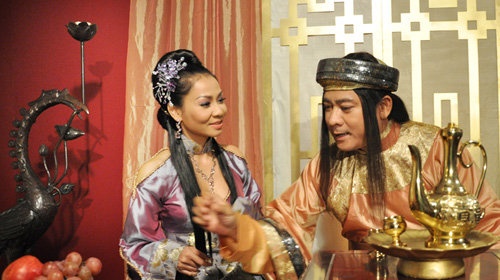 | Sự cẩu thả trong việc thiết kế trang phục cộng thêm những bất đồng nội bộ đoàn làm phim khiến Anh chàng vượt thời gian phải ngưng phát sóng trên VTV khi mới chỉ đi đường hơn nửa chặng đường. Trong ảnh là tạo hình của ca sĩ Thu Minh trong vai quý phi Lệ Liễu. Ảnh: Chụp màn hình |