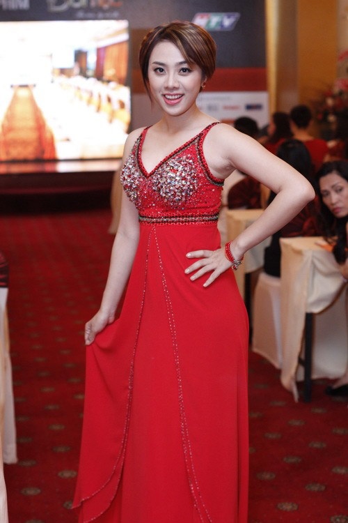 | Lan Trinh trông già nua và quê mùa trong chiếc váy đỏ đính hạt thiếu tinh tế. |