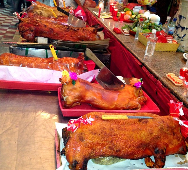 Xung quanh chùa có rất nhiều điểm bán hoặc cho thuê heo quay. Giá heo quay ở những nơi này sẽ đắt hơn khoảng 50.000 đồng/kg, chưa kể heo để lâu, hoặc có khi là heo tái sử dụng vì trước đó đã có người đem vào cúng. Nếu bạn không thể mang heo quay từ nhà thì tốt nhất là không mua hoặc thuê heo quay tại chùa.