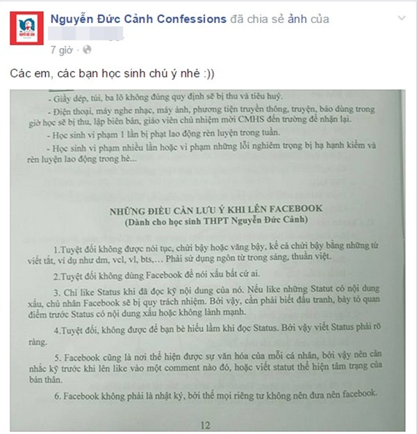 | Chia sẻ về bản nội quy được đăng tải trên trang Confession của trường THPT Nguyễn Đức Cảnh - TP Thái Bình. |