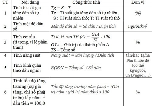 Trước hết, để học sinh có thể thực hiện được phần xử lý số liệu trong các bài thực hành nhận xét bảng số liệu và vẽ biểu đồ, giáo viên tổng hợp một số công thức thường dùng để tính toán sau đó cho học sinh thực hành (thực hiện ở phần nhận xét bảng số liệu và vẽ biểu đồ).