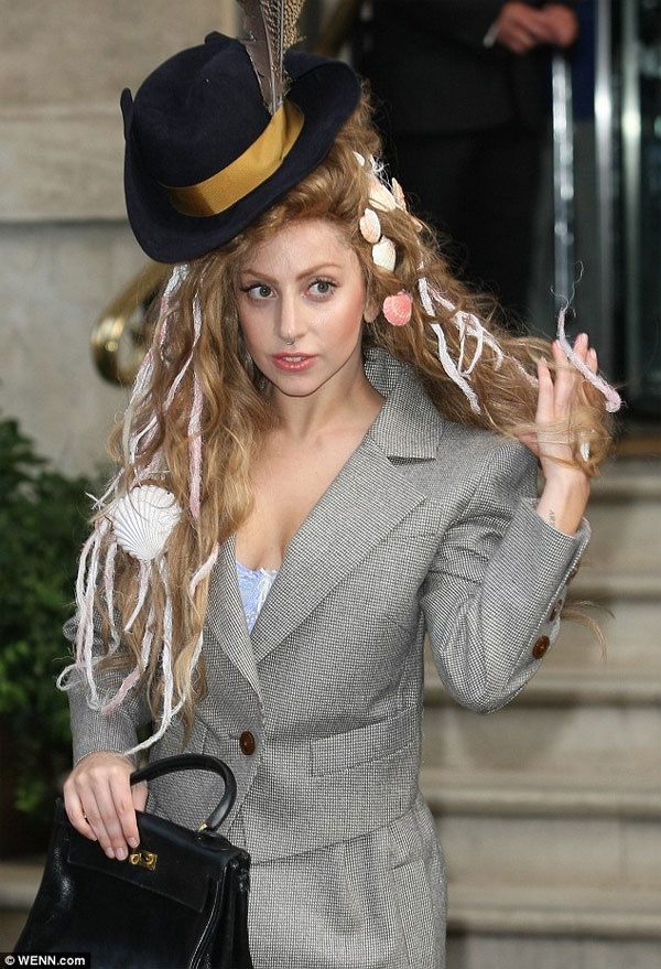 | Xuất hiện tại một khách sạn ở London hôm thứ 4, Lady Gaga đội mũ gắn lông, mái tóc trang trí vỏ sò và rối bù như tổ quạ. Tuy nhiên trong cô rất hào hứng với style tóc mới của mình. |