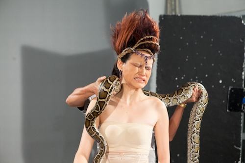 Một trong những màn biểu diễn “hết hồn” nhất chính là cảnh một giọng ca nữ ăn mặc sexy ngồi trên xích đu cất cao giọng hát trong trẻo đầy tự tin. Cô dần dần được thả xuống một thùng nước lạnh, dưới đó người ta đổ đầy những con rắn bự. Dù khóc thét vì sợ hãi, cô vẫn phải tiếp tục cất giọng hát theo tiếng nhạc trong khi những chú rắn quấn chặt lên người.