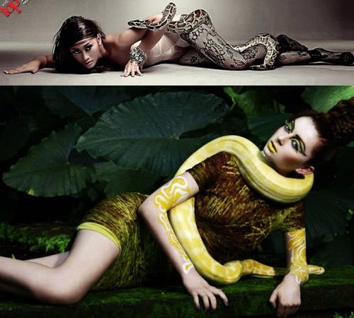 Việc đưa rắn hay trăn vào làm bạn chụp hình là một ý tưởng khai thác yếu tố cá tính mạnh mẽ. Tuy nhiên, điều này cũng bị lạm dụng đối với những bộ ảnh người đẹp khỏa thân gây phản cảm. Những phát ngôn chụp hình thân thiết bên trăn vì muốn nêu cao ý thức bảo vệ rừng và động vật quý hiếm nếu không đi đôi với tính nghệ thuật trong những bộ ảnh sẽ dẫn đến cái nhìn thiếu thiện cảm với những ngôi sao nữ.