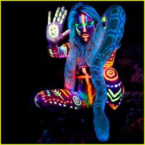 | KeSha uốn éo cùng một chú trăn trong hang động với toàn bộ body được vẽ sơn dạ quang. |